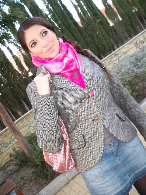 La manera de resumir este look es: llevo todo lo que me apetecía llevar :) Tenía muchas ganas de estrenar mis nuevos tacones rosa fucsia de Blanco, tenía muchas ganas de ponerme las medias grises plomo tupidas de Mercería Muñoz, y tenía muchas ganas de ponerme la chaqueta de Zara :) Así que... me puse todo!